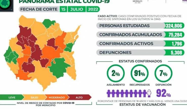 La Secretaría de Salud informa que a la fecha en Morelos se han estudiado 324 mil 806 personas, de las cuales se han confirmado 75 mil 284 con coronavirus COVID-19; mil 796 están activas y se han registrado 5 mil 308 defunciones.