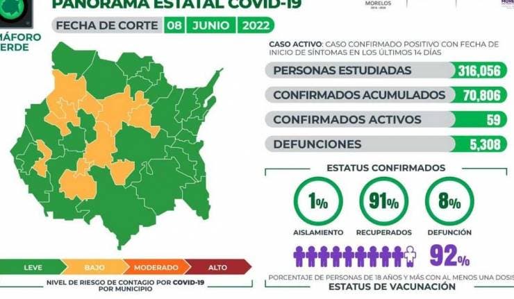 La Secretaría de Salud informa que a la fecha en Morelos se han estudiado 316 mil 056 personas, de las cuales se han confirmado 70 mil 806 con coronavirus COVID-19; 59 están activas y se han registrado 5 mil 308 defunciones.