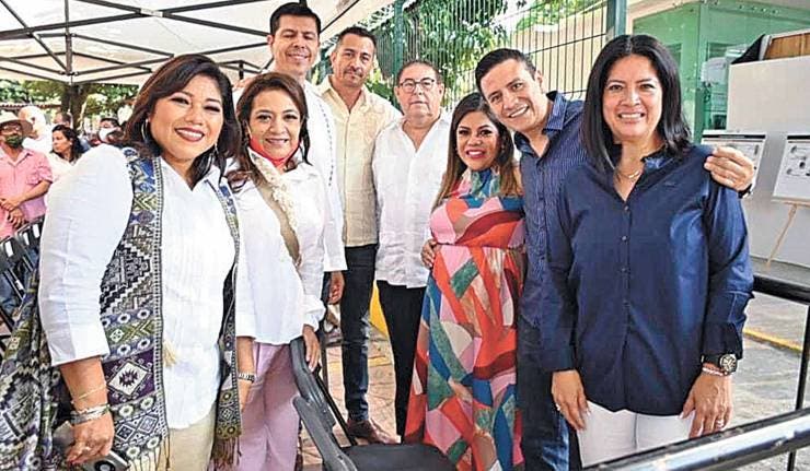 Al centro, el secretario de Movilidad, Víctor Mercado, con los hermanos Sergio y Arturo Pérez Flores, Senador y diputado local, respectivamente, y las diputadas locales Paola Cruz, Erika Hernández, Ariadna Barrera y Mirna Zavala Zúñiga.