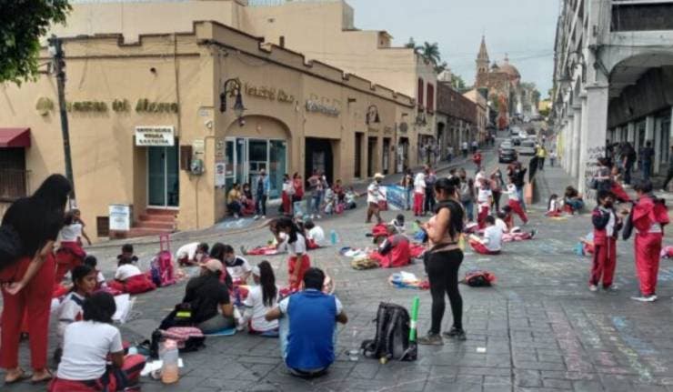 En el centro de Cuernavaca, esta mañana menores con profesores y maestros de la primaria “18 de abril de 1869” de Alpuyeca bloquearon la calle Galeana, y tomaron clases al aire libre. Piden construcción de barda perimetral que está a punto de caer.
