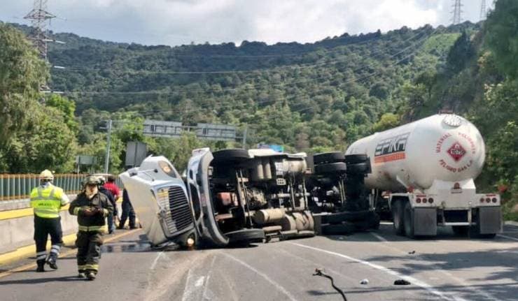 Esta tarde una pipa de gas doble semiremolque con 40 mil litros cada una, volcó en el kilómetro 24 de la autopista México-Cuernavaca, dirección Morelos.