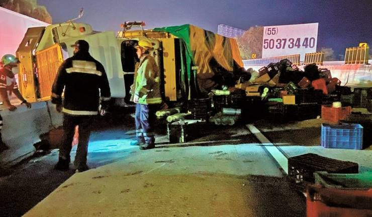 Cuernavaca, MORELOS.- Debido al exceso de carga y la falta de precaución, un camión cargado con varias toneladas de abarrotes volcó sobre el Paso Express, a la altura de la colonia Antonio Barona.