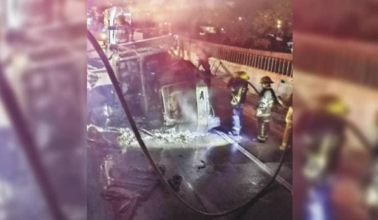 El percance se registró a las 01:50 horas de ayer en el kilómetro 89 del Paso Express, cerca de Plaza Galerías, donde una grúa que transitaba hacia el sur por los carriles centrales volcó y se quemó.