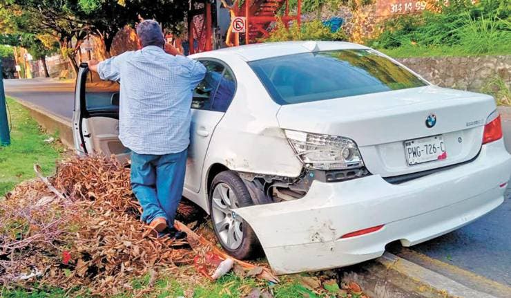 Cuernavaca.- Encima del camellón de la avenida Vicente Guerrero, de la colonia Lomas de la Selva, quedó un auto BMW blanco, luego de que presuntamente su conductor perdiera el control por manejar a exceso de velocidad.