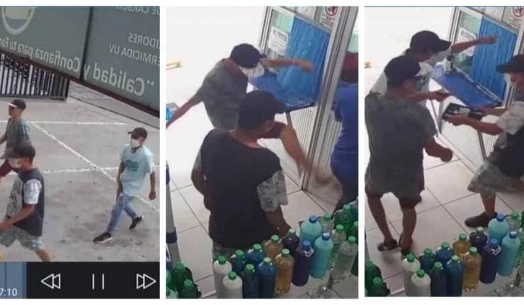 Uno de ellos, de bermuda roja y playera gris, patea la puerta del negocio.