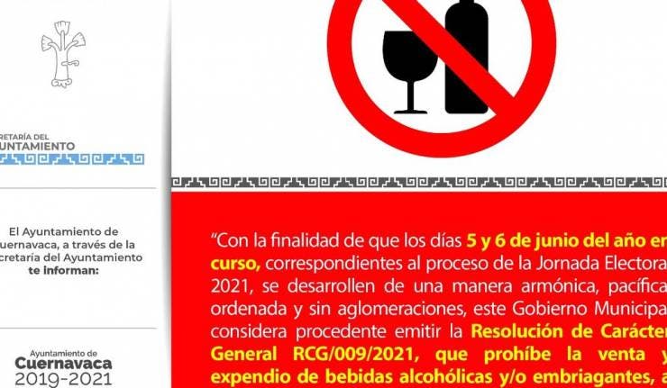 A partir del mediodía del 5 de junio y hasta las 23:59 pm del domingo 6 de junio, quedará prohibida la venta y expendio de bebidas alcohólicas o embriagantes en el municipio de Cuernavaca.