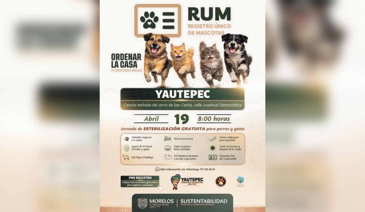 Yautepec, Morelos.- Con el objetivo de controlar la sobrepoblación de animales en situación de calle y fomentar la cultura del dueño responsable, el Ayuntamiento de Yautepec anunció una jornada gratuita de esterilización para perros y gatos el próximo domingo 19 de abril.
