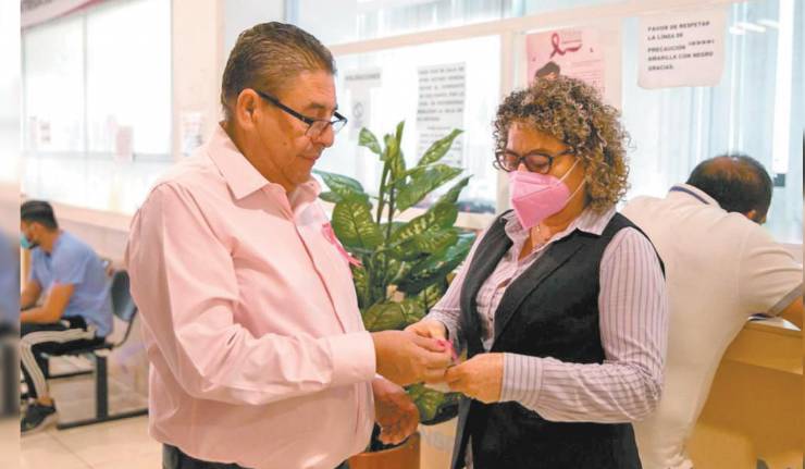 Víctor Mercado Salgado, titular de Movilidad y Transporte, recorrió las instalaciones para entregar a las y los trabajadores, así como a contribuyentes, un moñito rosa, e información sobre factores de riesgo de cáncer de mama, que no es exclusiva de la mujer.