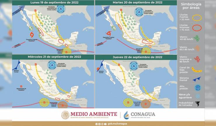 El ciclón tropical “Madeline” continuará desplazándose frente a la costa occidental del territorio nacional, lo que, sumado a canales de baja presión en el Golfo de México e interior del país, mantendrá inestabilidad y desarrollo de tormentas y lluvias en diversos estados del territorio nacional.