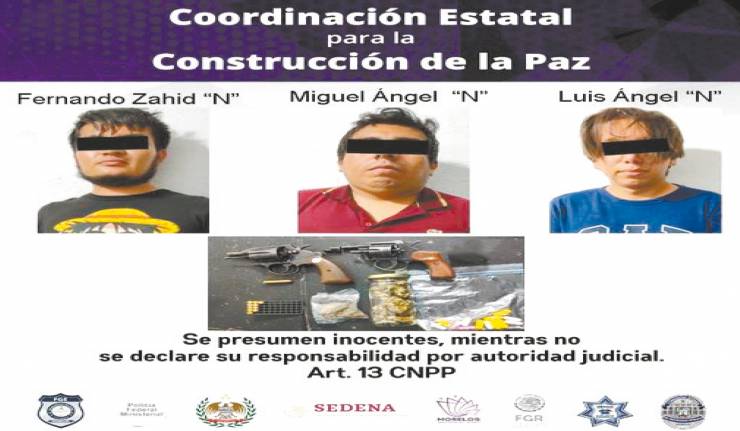 Tepoztlán, MORELOS.- Tras echar balazos en una cancha del poblado de San Juan Tlacotenco, tres hombres fueron asegurados con dos pistolas y dosis de mariguana y cocaína.