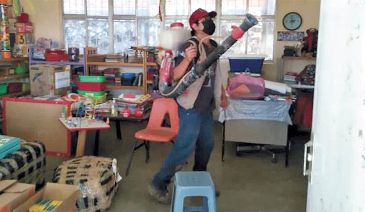 Tepoztlán, MORELOS.- Direcciones municipales realizaron desinfección de espacios escolares contra enfermedades transmitidas por vector, con el fin de que a partir de la siguiente semana, padres de familia y autoridades escolares lleven a cabo trabajos preparativos para reinicio de clases.