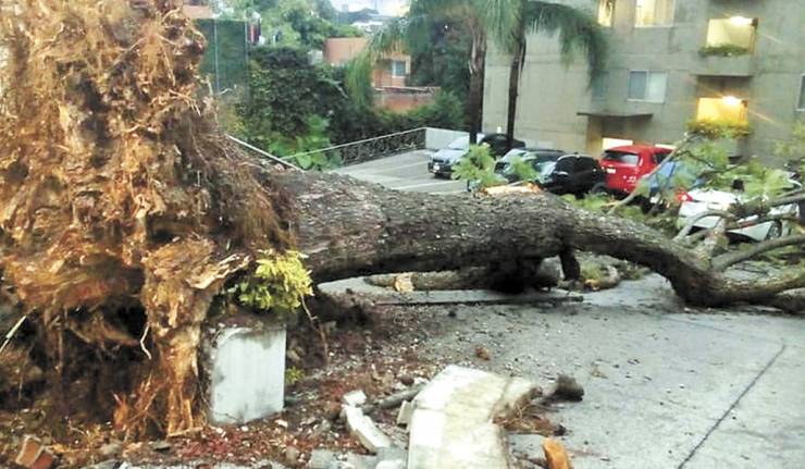 La intensa lluvia registrada durante la tarde noche de ayer causó el derribo de un árbol en Ciudad Chapultepec causando daños a dos vehículos; además se reportaron apagones en varias colonias de la capital.