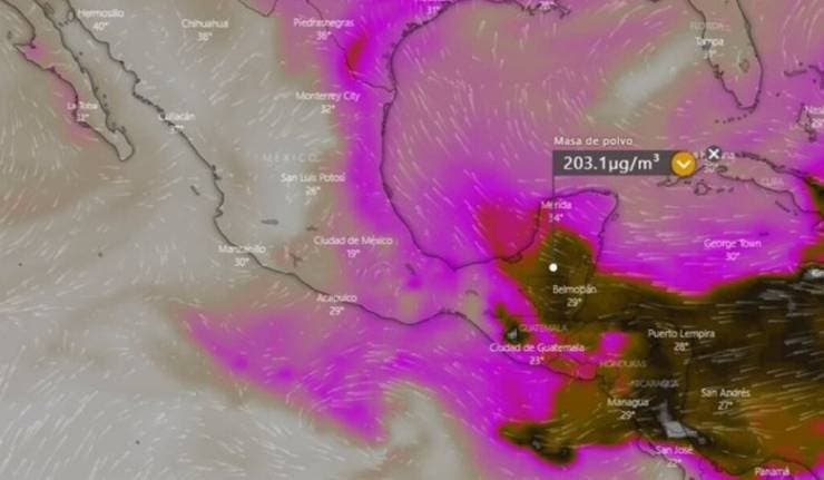 La nube que proviene en cúmulo de polvos del desierto del Sahara ya arribó a México y la tarde del martes hubo partículas que tienen un diámetro de 2.5 micrómetros sobre la península de Yucatán, en cantidades de 203 microgramos sobre metro cúbico (µg/m³).