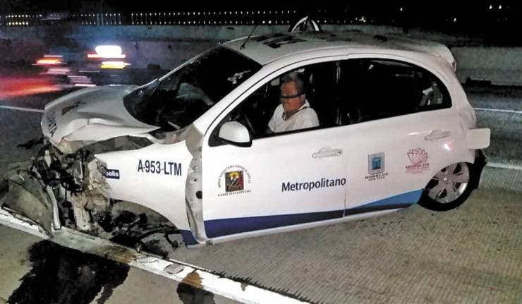 Un taxi March quedó destrozado tras ser impactado por una camioneta cuando transitaban hacia el sur por el Paso Express, la noche del miércoles, a la altura de la colonia Flores Magón. El taxista mencionó que la camioneta lo impactó por detrás, causó que perdiera el control y topara contra el muro de contención. Foto: STAFF / DDM