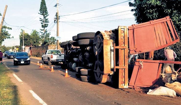 Tlayacapan, MORELOS.- Una aparatosa volcadura de un camión cargado con abono dejó como saldo cuantiosos daños materiales, la tarde del sábado sobre la carretera Tlalnepantla-Oaxtepec.
