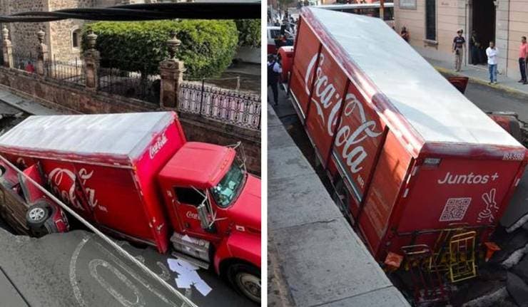 VIDEO: Socavón 'engulle' a una camioneta con 3 menores y un camión de Coca-Cola