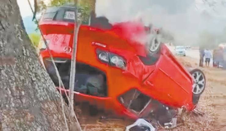 Testigos comentaron que el vehículo era tripulado por una pareja con dirección al norte, pero perdieron el control, volcaron y además chocaron contra un árbol.