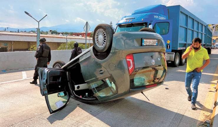 Cuantiosos daños materiales y caos vial fue el saldo que dejó una volcadura ocurrida la tarde de ayer sobre el Paso Express, a la altura de la colonia Flores Magón, en Cuernavaca. Al parecer un tráiler impactó primero a un auto compacto que se salió de control y terminó volcando. Ambos involucrados fueron asegurados por autoridades.