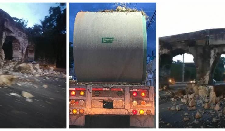 Según testigos, el operador del tráiler quiso pasar por abajo del histórico acueducto, pero no calculó y pasó a traer parte del mismo, dado que la altura máxima es de 4.20 metros.