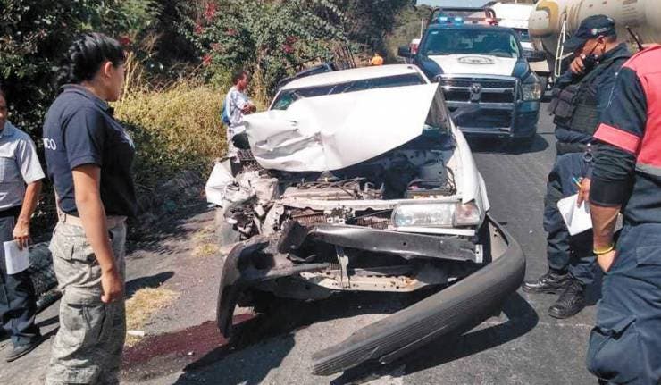 Un auto Nissan-Tsuru, color blanco, quedó destrozado del frente tras chocar por alcance contra una una camioneta Nissan Estaquitas, color azul, cuyo conductor frenó repentinamente al romperse una de las horquillas, cuando circulaban por la carretera federal Cuautla-Cuernavaca, a la altura de Cañón de Lobos, en Yautepec.