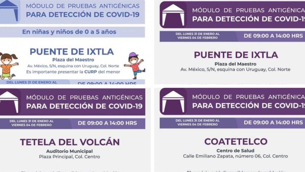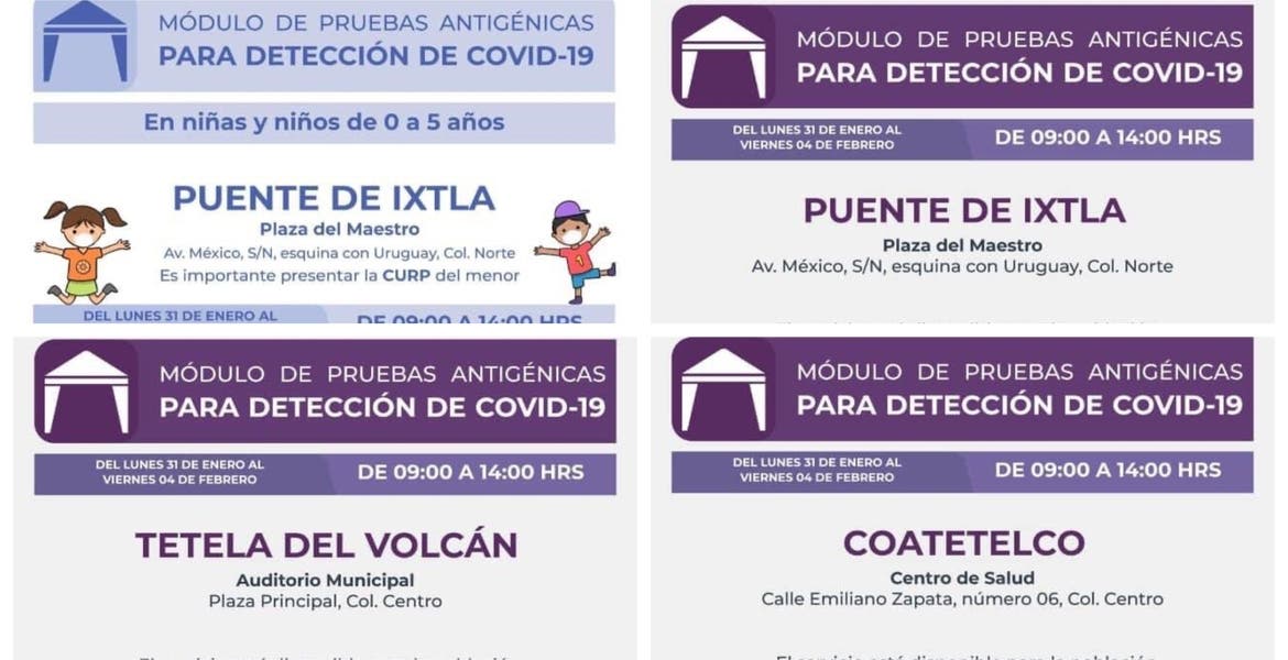 En Tetela del Volcán, la brigada de SSM estará en el auditorio municipal, Plaza Principal, colonia Centro; la prueba de antígeno estará disponible a partir de los seis años de edad.