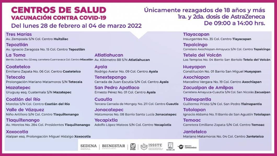 Como parte del plan piloto de vacunación contra COVID-19 en unidades médicas enfocado a la aplicación de primera o segunda dosis de AstraZeneca a personas rezagadas de 18 años y más, las autoridades estatales y federales informaron que la inmunización se amplió a 27 centros de salud, pertenecientes a Servicios de Salud de Morelos (SSM), en un horario de 09:00 a 14:00 horas, del lunes 28 de febrero al viernes 04 de marzo del 2022.