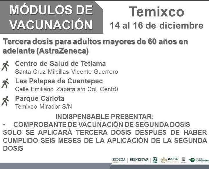 Atlatlahucan, Ayala, Axochiapan y Temixco vacunarán con la dosis de refuerzo a adultos mayores de 60 años.