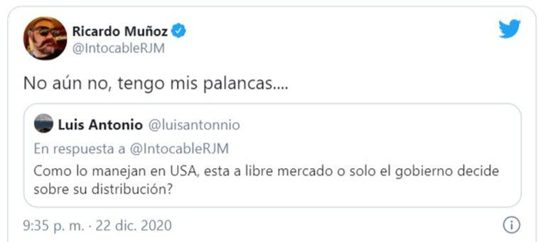 “¿Cómo lo manejan en USA, está a libre mercado o sólo el gobierno decide sobre su distribución?, le preguntó un usuario de nombre Luis Antonio, a lo que el cantante de regional mexicano aseguró citando el tuit: “No, aún no, tengo mis palancas…”