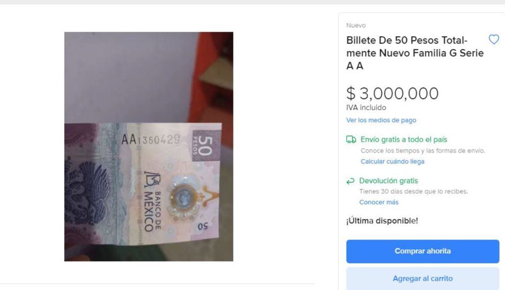 Los coleccionistas de billetes y monedas acostumbran utilizar Mercado Libre para obtener las piezas que les hacen falta. De esta forma es como se han dado a conocer artículos como la moneda de bronce de Cuauhtémoc, que vale 125 mil pesos, o el billete de 50 pesos que vale una fortuna. Pero este billete le gana a los anteriores, ya que el valor nominal de esta pieza, es superada por mucho por su precio.