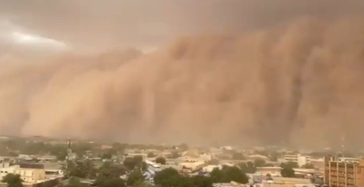 Una tormenta de arena rojiza envolvió la ciudad de Niamey, capital de Níger, en África occidental. Imágenes que circulan en redes sociales muestran el momento en que el muro de polvo rojo “barre” la capital de Níger. La tormenta de arena envolvió edificios en su camino.