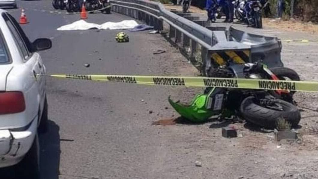 El incidente se produjo a la altura del poblado de Chamilpa, poco antes de llegar al entronque con la Glorieta de la Paloma de la Paz, cuando el conductor de la motocicleta Kawasaki color verde perdió el control y se impactó contra la barra de metal, quedando los cuerpos tirados en la cinta asfáltica.