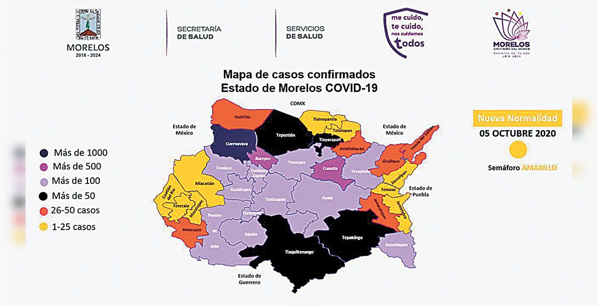 Hasta este lunes en Morelos se registran seis mil 146 casos de COVID-19, de los cuales 122 son casos activos, existen 874 casos sospechosos y van mil 161 defunciones, colocándose en las entidades con menor número de casos registrados.