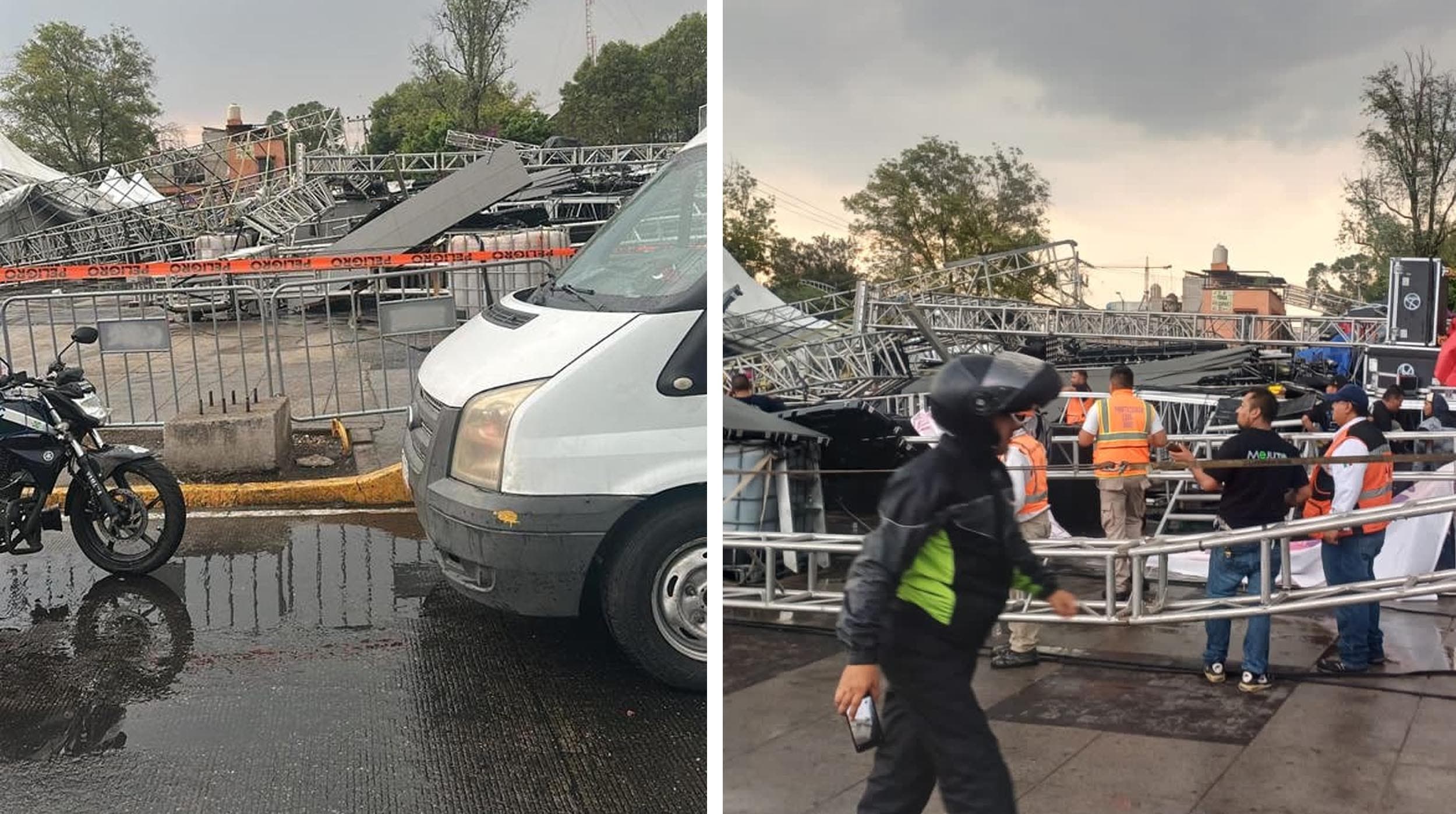 El accidente ocurrió la tarde de este jueves 8 de mayo, minutos antes de las 17:00 horas, justo cuando iniciaría el espectáculo musical en el que se presentarían artistas como Alicia Villarreal, Ángela Carrasco y Ana Cirré, como parte del show Grandiosas. Autoridades locales informaron que el colapso del escenario se debió a las fuertes ráfagas de viento y lluvias que azotaron esa zona de la capital.