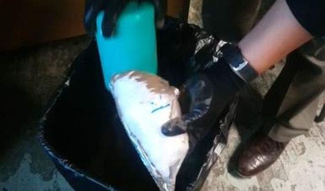 Baja California.-Personal de la Fiscalía General de la República (FGR) en Baja California aseguró una caja de tráiler donde se localizaron 100 kilos de la droga conocida como cristal y 12 kilos del narcótico llamado heroína, que estaban dentro de una caja que contenía botellas de cloro rellenas de las drogas