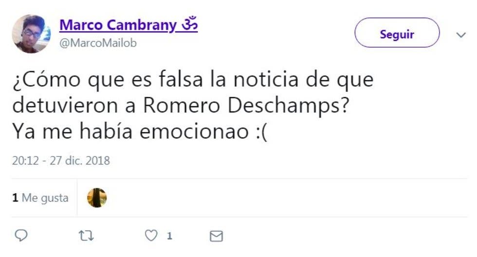 "La Marina detiene en su domicilio a Carlos Romero Deschamps, por el delito de corrupción.", señala un tuit de la cuenta @MedialogMX que fue compartido en diversas plataformas.