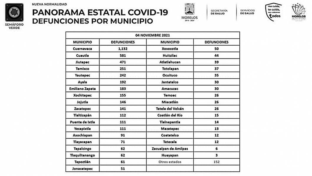 Las nuevas defunciones se registran en 2 masculinos de Emiliano zapata y Xochitepec, que presentaban obesidad y tabaquismo; también 1 fémina de Ayala, que padecía hipertensión e insuficiencia renal crónica.