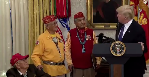 Hablando sin discurso preparado, Trump dijo a los veteranos indígenas que a diferencia de Warren, "ustedes son gente especial. Ustedes son realmente gente increíble. Desde el corazón, realmente desde el corazón, apreciamos mucho lo que han hecho, como lo hicieron. El valor que mostraron".