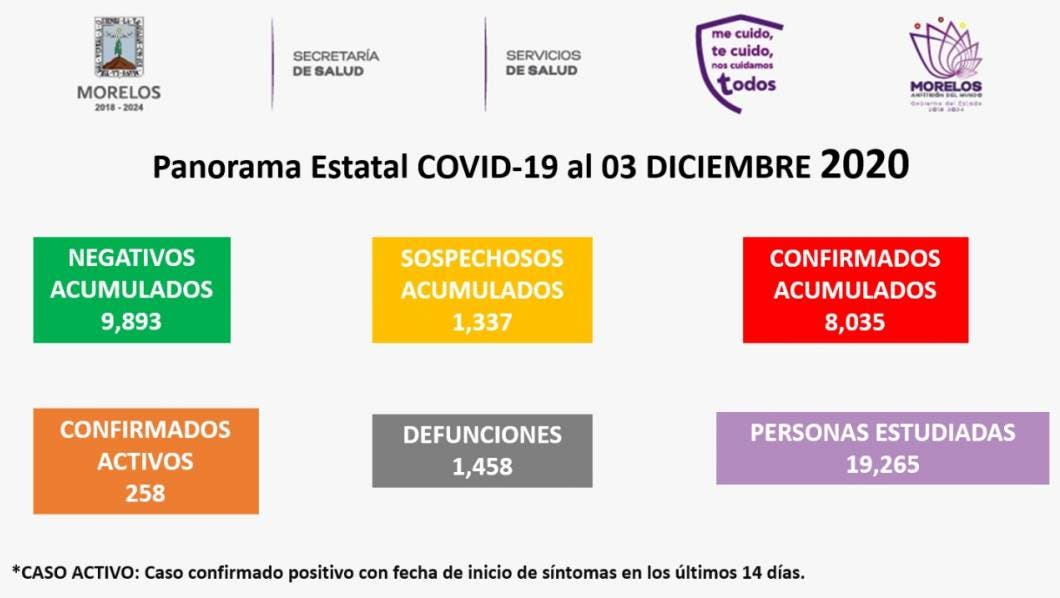 La Secretaría de Salud informa que a la fecha en Morelos se han estudiado 19 mil 265 personas, de las cuales se han confirmado ocho mil 035 con coronavirus COVID-19, 258 están activas, descartado nueve mil 893 y están como sospechosas mil 337; se han registrado mil 458 defunciones.