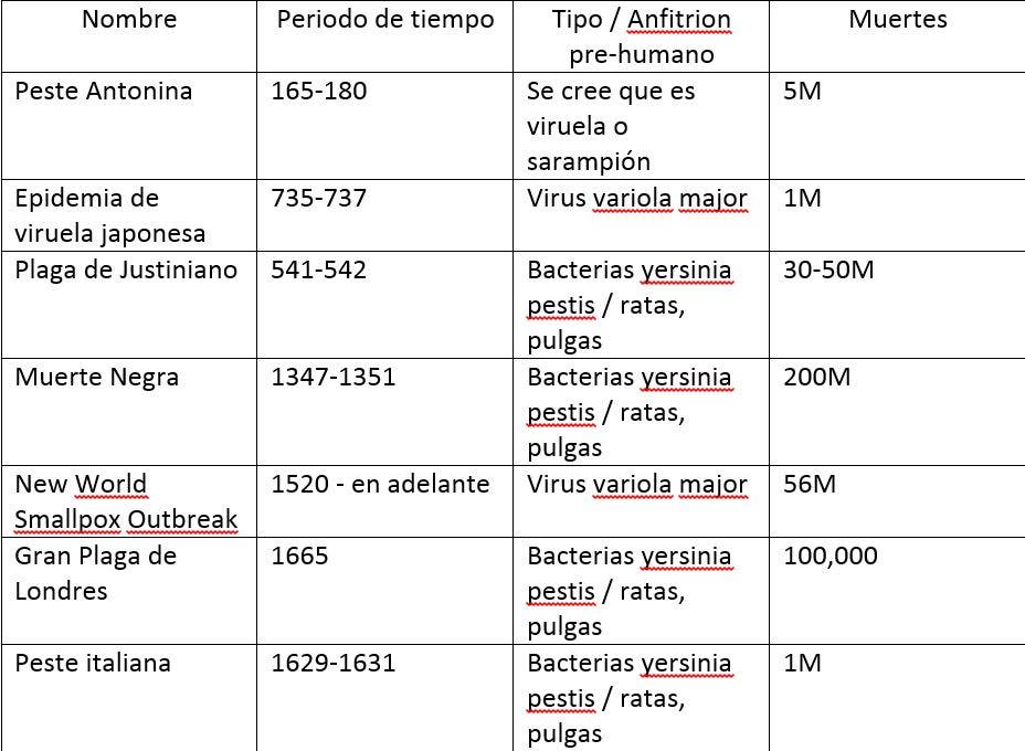 Nota: Muchos de los números de víctimas mortales enumerados anteriormente son las mejores estimaciones basadas en la investigación disponible. Algunos, como la peste de Justiniano, están sujetos a debate en función de nuevas pruebas.