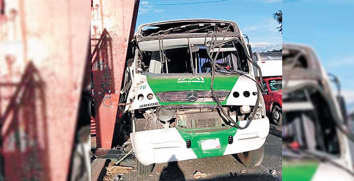 Un camión de la línea “Verdes de Morelos” se estampó contra la base de un puente peatonal en Paseo Cuauhnáhuac, al intentara esquivar a otra ruta que invadió su carril