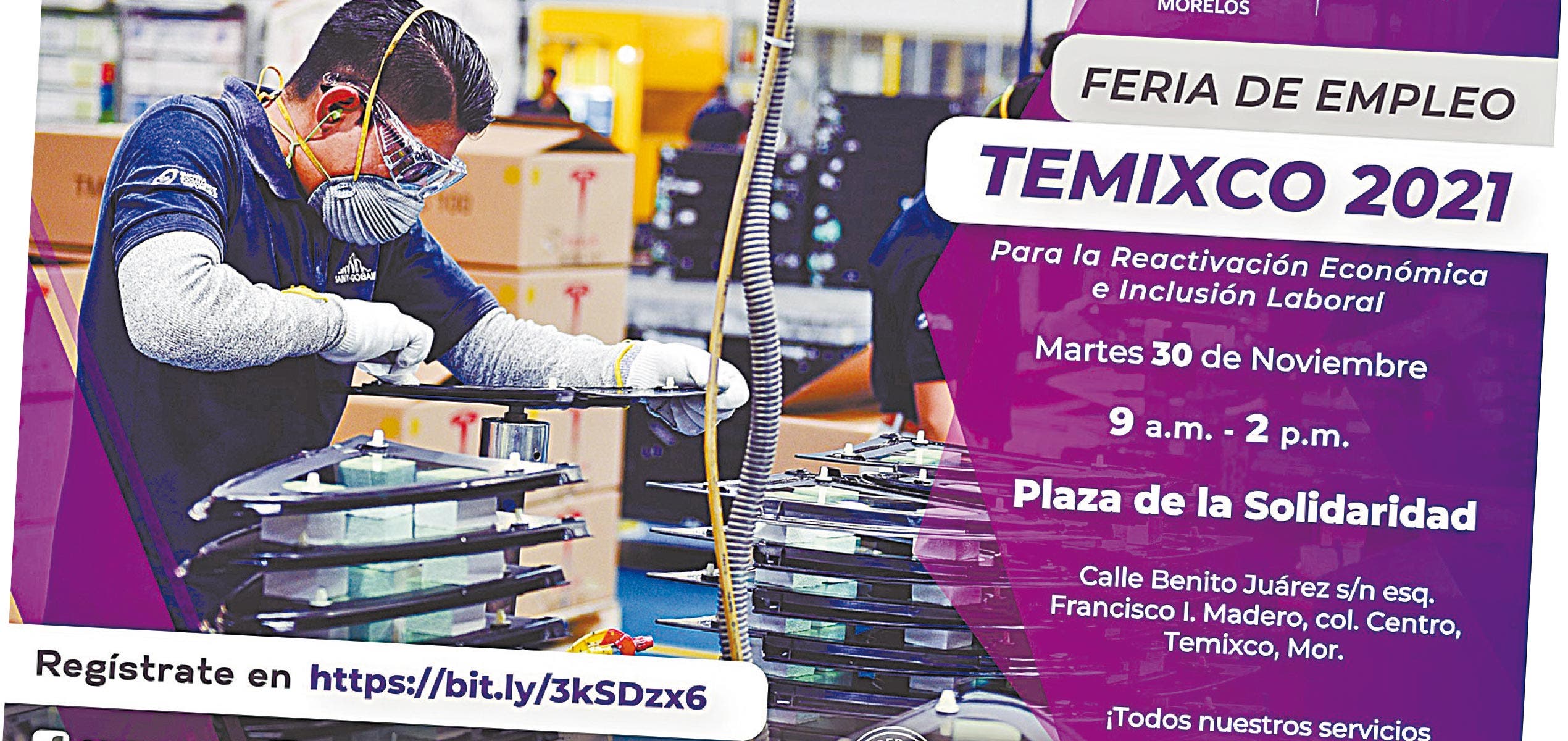 El Ayuntamiento de Temixco realizará la Feria del Empleo 2021, como parte del programa para la reactivación económica e inclusión laboral, este martes 30 de noviembre. Los interesados deben presentarse de 9 a 14 horas, en la Plaza Solidaridad.