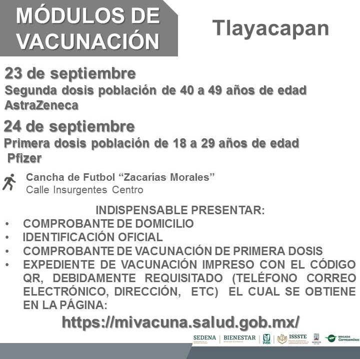 En Tlayacapan, la inmunización con segundas dosis de AstraZeneca para personas de 40 a 49 años se realizará el jueves 23 de septiembre de 10:00 a.m. y hasta finalizar con las dosis asignadas en: