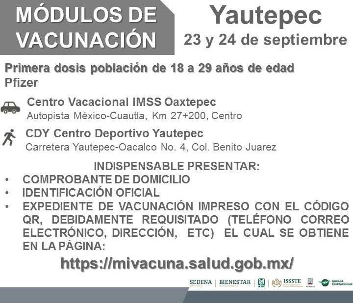 En Yautepec, la aplicación de primeras dosis de Pfizer para la población de 18 a 29 años se realizará el jueves 23 y viernes 24 de septiembre en: