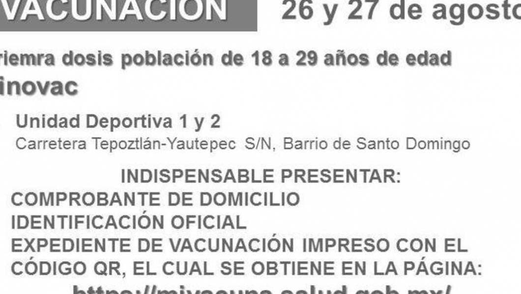 En el municipio de Tepoztlán la aplicación de la vacuna contra COVID-19 para personas de 18 a 29 años se llevará a cabo este jueves 26 y viernes 27 de agosto a partir de las 9:00 a.m. y hasta concluir las dosis asignadas por Punto de Vacunación. Las sedes de aplicación se ubicarán en: