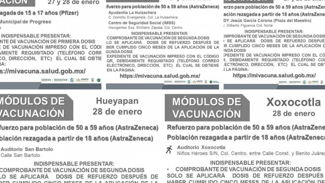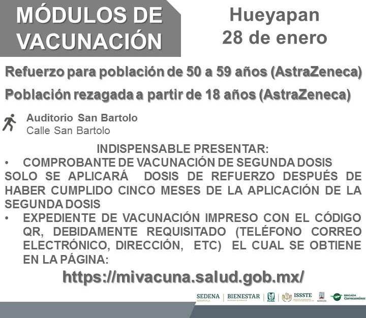 En Hueyapan, la vacunación de rezagados y refuerzo de AstraZeneca para personas de 50 a 59 años se realizará el viernes 28 de enero a partir de las 9:00 a.m. y hasta agotas las dosis en: