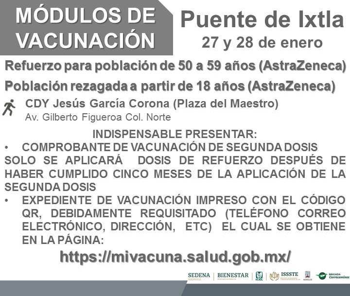 En Puente de Ixtla, la aplicación de refuerzo de AstraZeneca para personas de 50 a 59 años se desarrollará el jueves 27 y viernes 28 de enero a partir de las 9:00 a.m. y hasta agotas las dosis asignadas en: