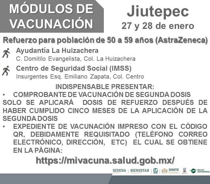 En Jiutepec, la vacunación de refuerzo de AstraZeneca para personas de 50 a 59 años se realizará el jueves 27 y viernes 28 de enero a partir de las 9:00 a.m. y hasta agotas las dosis asignadas en: