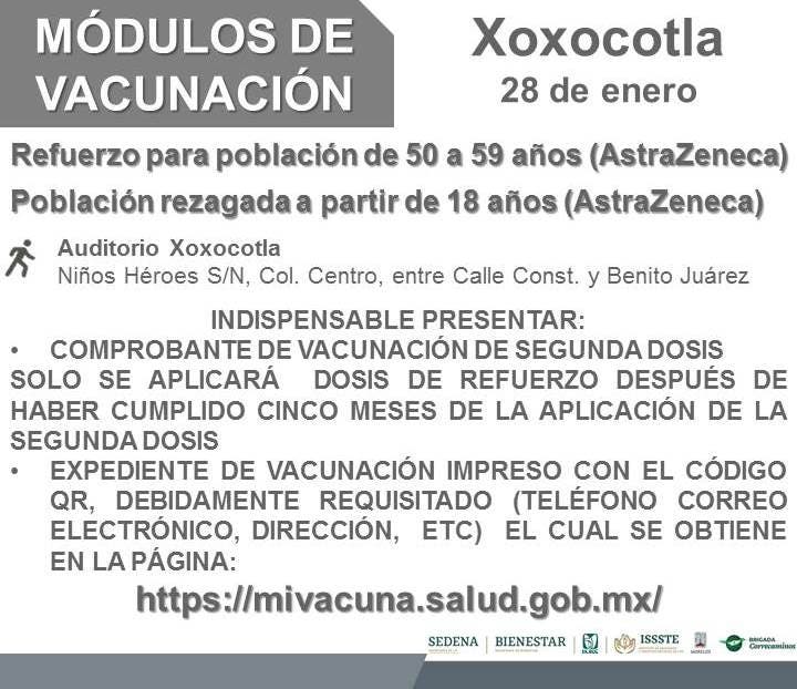 En Xoxocotla, la aplicación también de primeras, segundas y refuerzo de AstraZeneca para personas de 50 a 59 años también se llevará a cabo el viernes 28 de enero a partir de las 9:00 a.m. y hasta agotas las dosis en:
