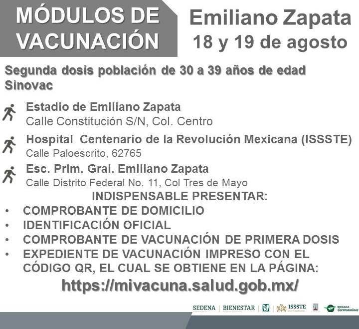 Las segundas dosis de la vacuna Sinovac en el municipio de Emiliano Zapata para personas de 30 a 39 años se aplicarán los días 18 y 19 de agosto a partir de las 9:00 a.m. y hasta concluir las dosis asignadas por Punto de Vacunación. Las sedes para este segmento de la población serán habilitadas en: