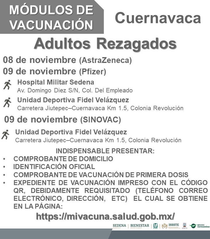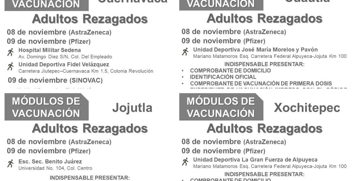 Mientras que el martes 9 de noviembre en Xochitepec, se desarrollará la vacunación de Pfizer para personas rezagadas también en la Unidad Deportiva la Gran Fuerza de Alpuyeca, bajo los mismos términos.